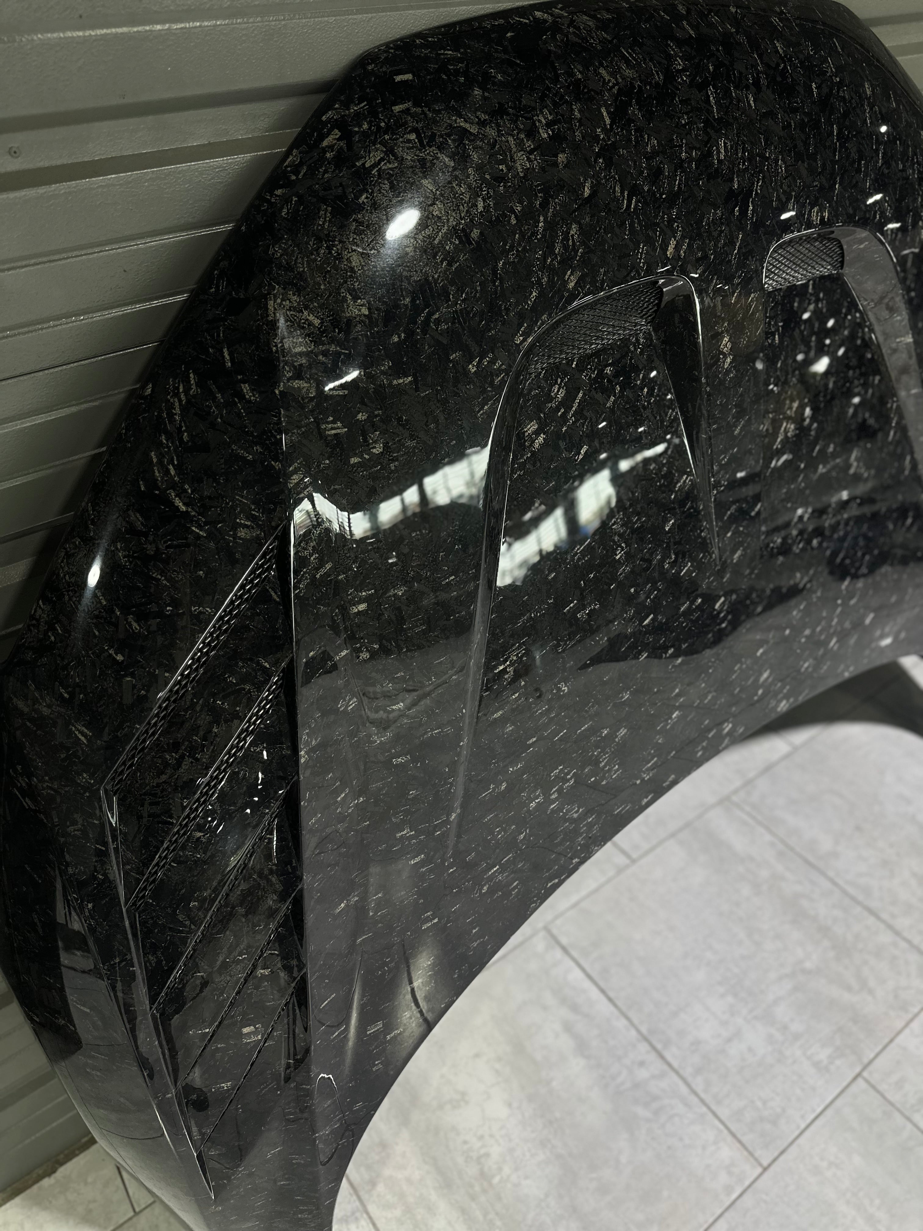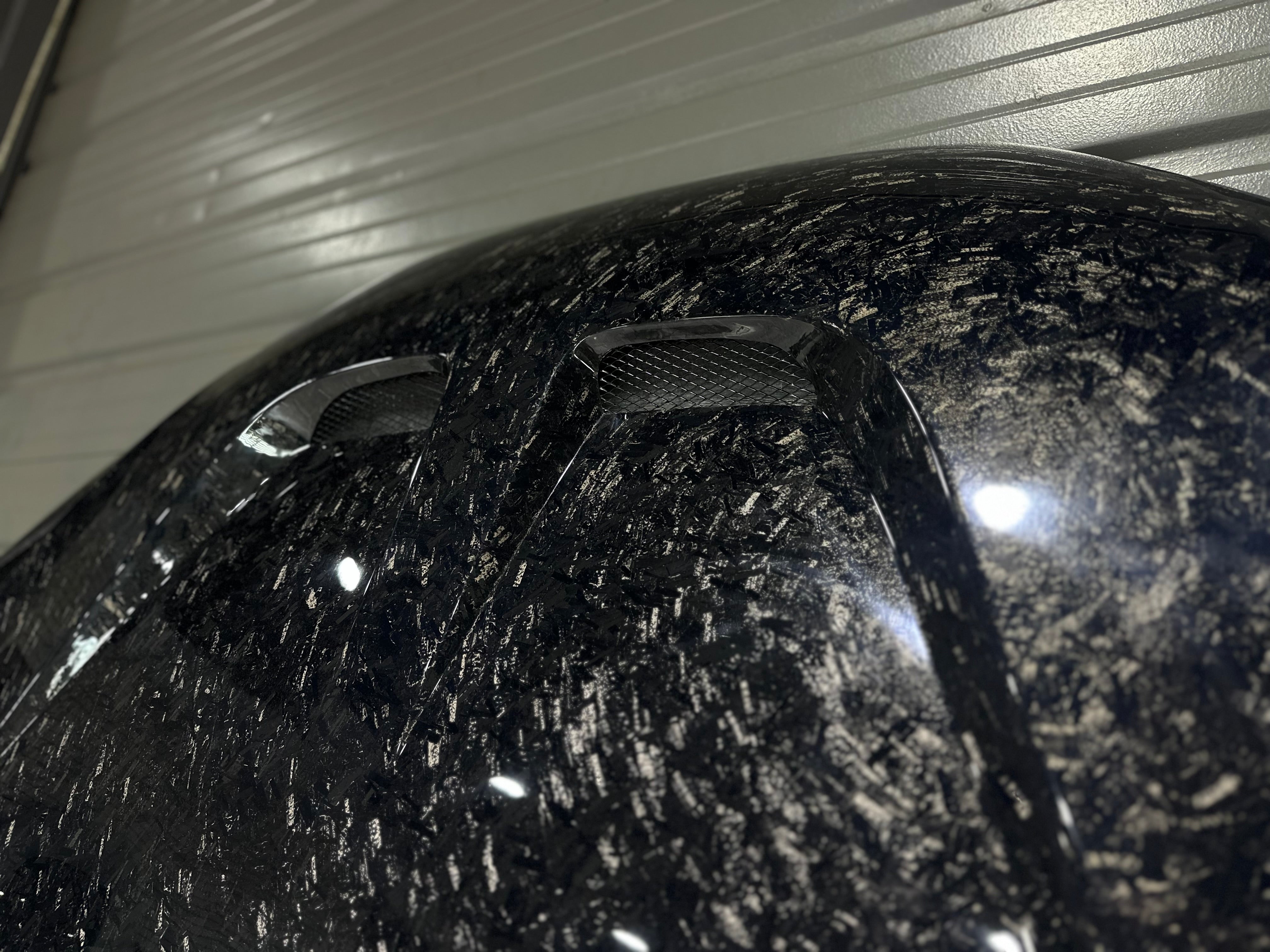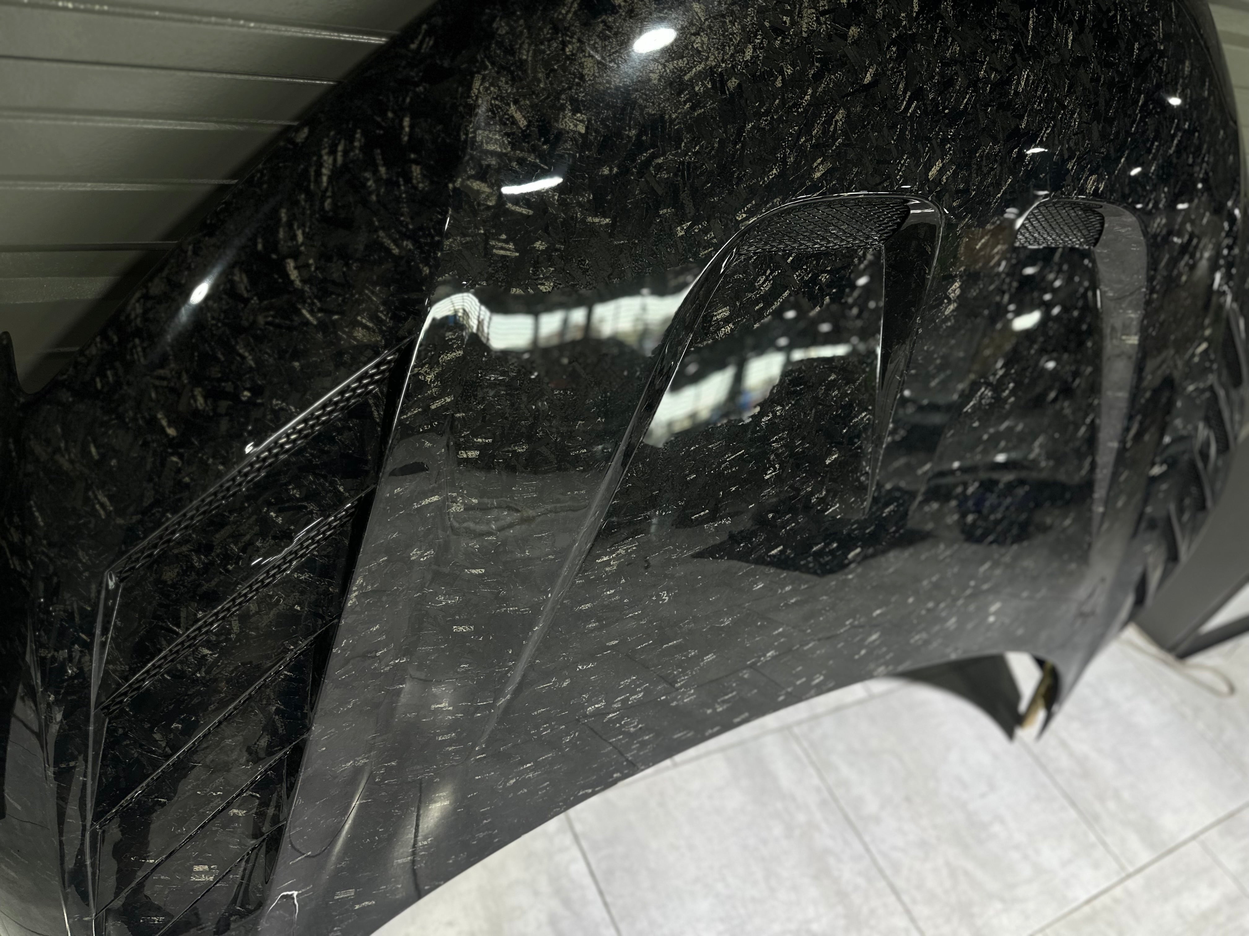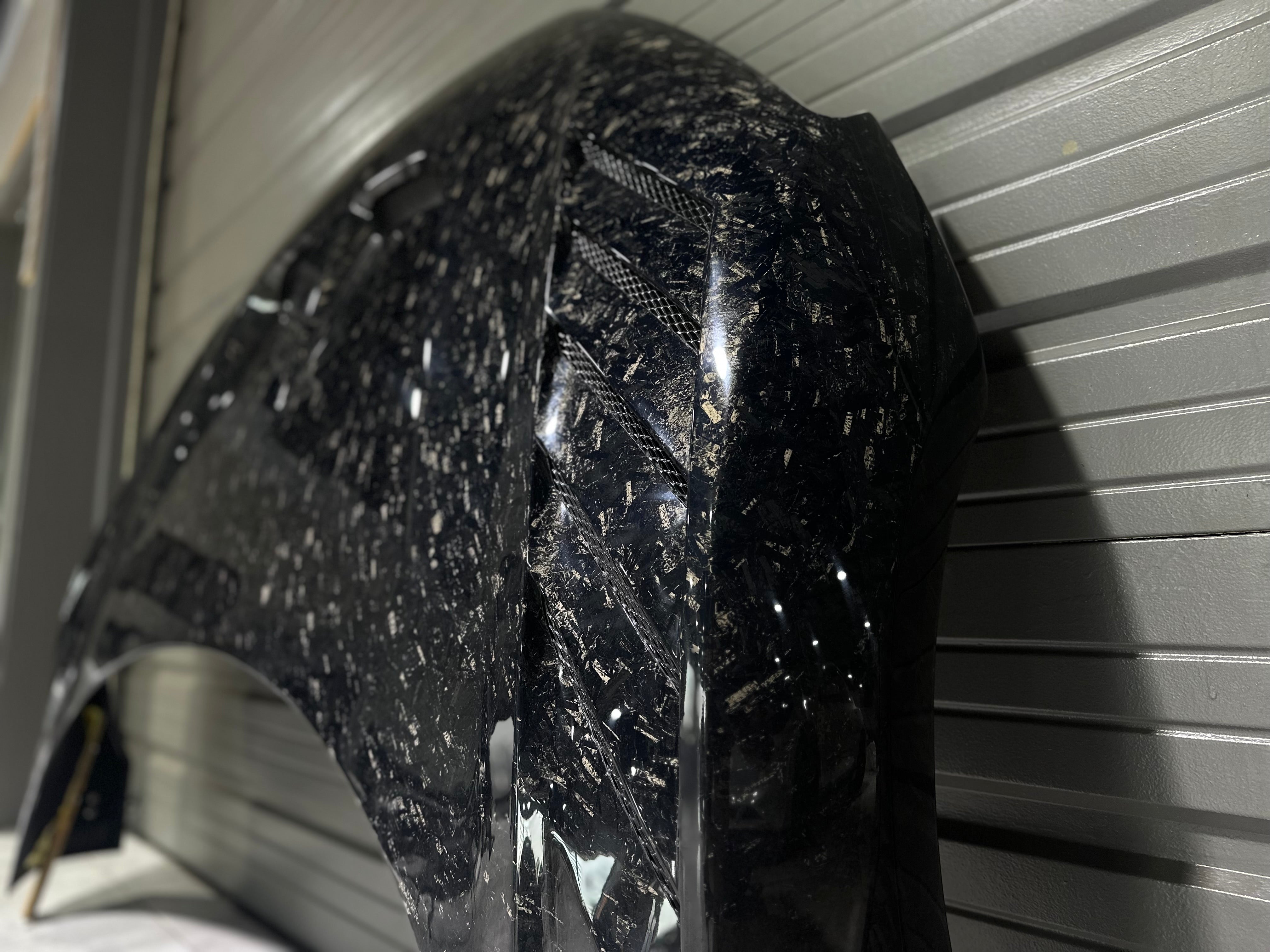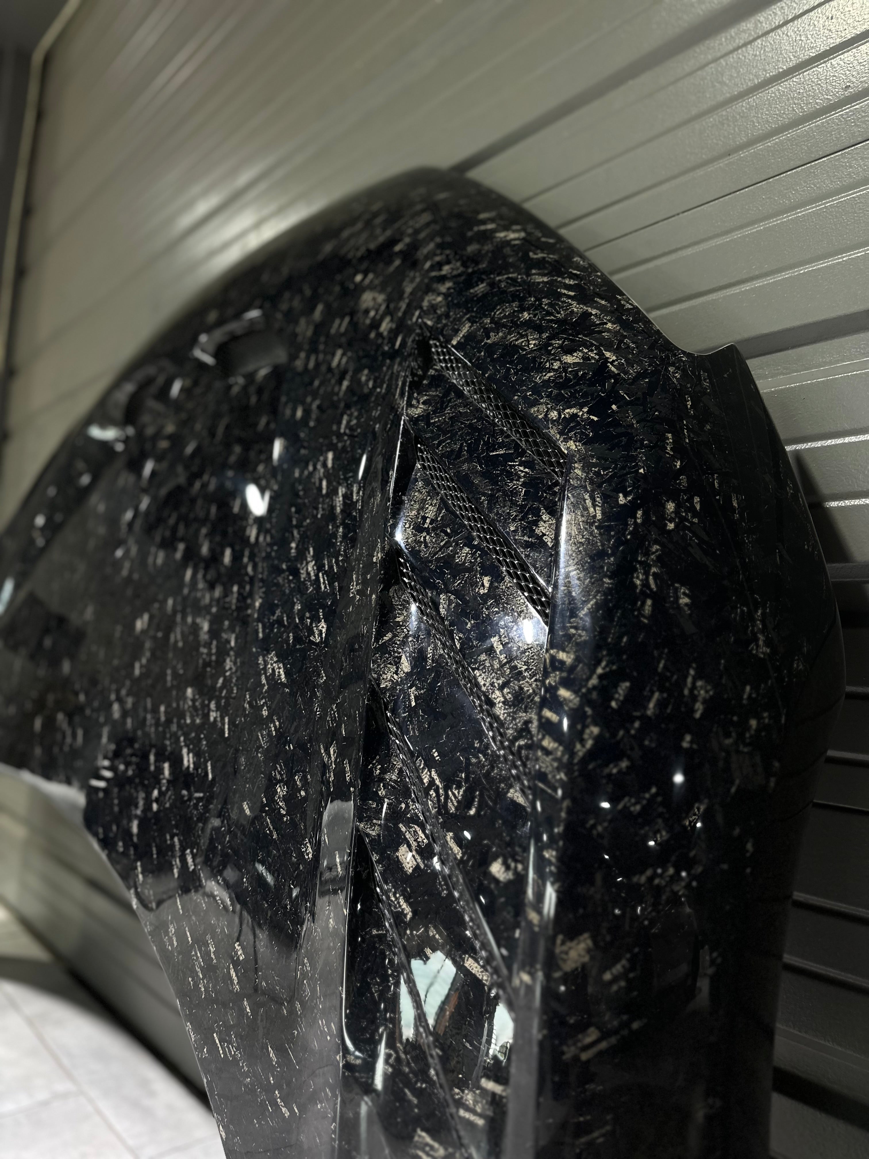 Forged (20% extra charge, made to order): Forged carbon fiber - a composite material made from randomly arranged, short carbon fiber strands combined with resin and compressed in a mold. Forged carbon fiber offers greater design flexibility compared to 3K woven carbon fiber, as it can be molded into more complex shapes without compromising structural integrity. Its random fiber orientation reduces weak points caused by the directional patterns in 3K weaves, enhancing impact resistance. Additionally, it has a unique aesthetic appeal, with a marbled texture that stands out from the uniform weave of 3K carbon fiber.